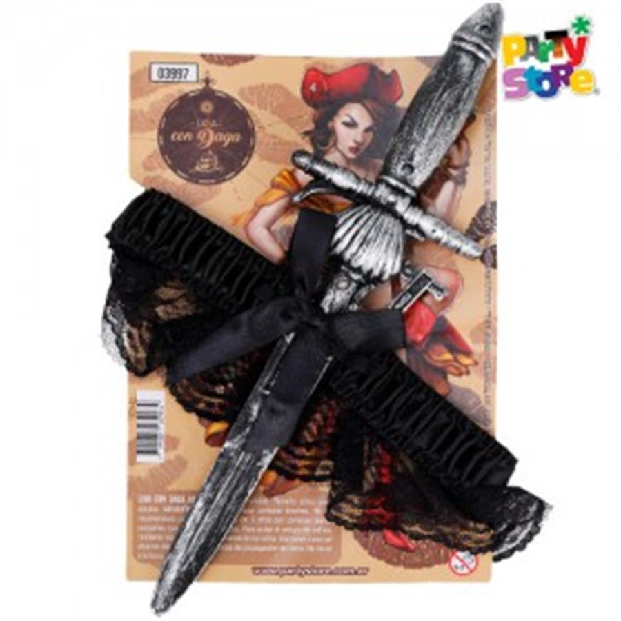 Incluye gorro pirata con pluma,medias red, liga con daga y parche pirata.